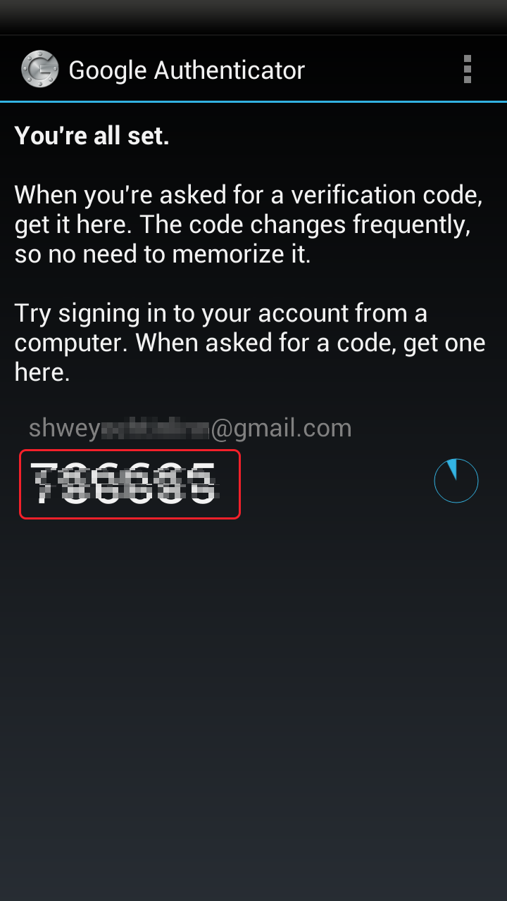 13. Google Authenticator setup successful တဲ့။ OK ကို နှိပ်ပါ။ ကျွန်တော်တို့ရဲ့ Gmail ကို login ဝင်မယ်ဆိုရင် Username နဲ့ Password သိရုံနဲ့ ဝင်လို့မရတော့ပါဘူး။ Google Authenticator app ထည့်ထားတဲ့ အခု ကျွန်တော်တို့ setup လုပ်ခဲ့တဲ့ ဖုန်းပါ ရှိမှ ဝင်လို့ရပါတော့မယ်။